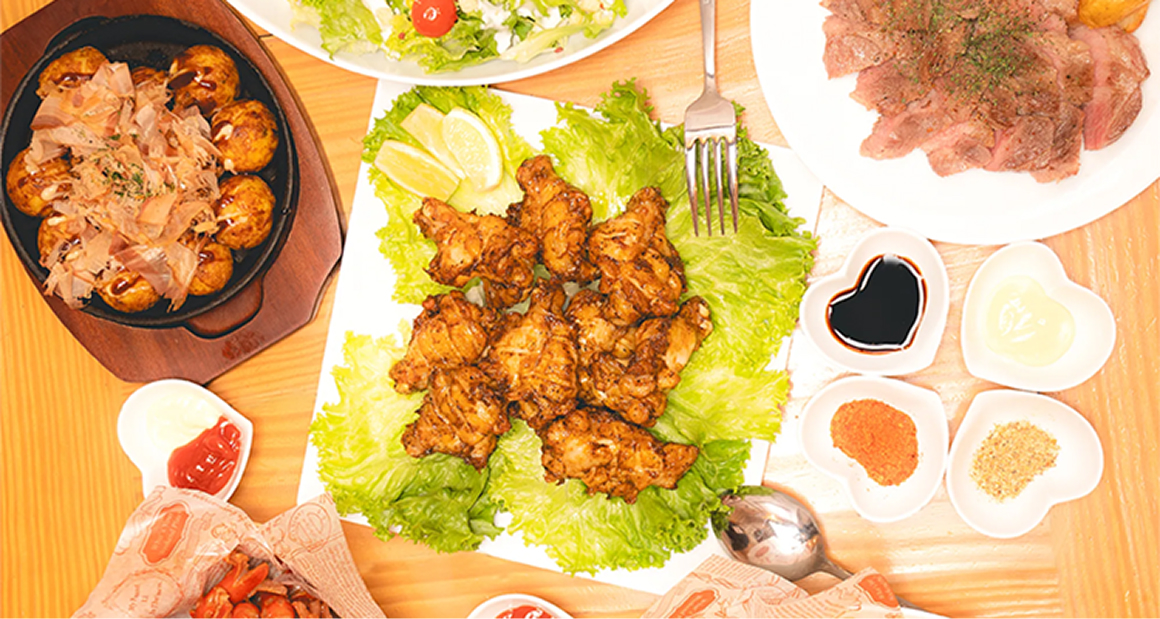シーザーサラダ/フライドポテト/たこ焼き/ チキンウイング(4種のスパイス)/タコちゃんウィンナー/ 天元豚のステーキ